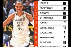 据统计,本场过后阿贾-威尔逊在季后赛盖帽数来到108个,她也超越格里娜,独居WNBA历史第3位。在她身前是坎迪斯-帕克的117次和丽莎-莱斯莉的132次。