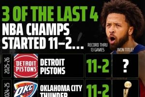 体育资讯11月17日讯 活塞媒体Pistons Talk晒出了一个惊人的巧合数据,近4年的NBA总冠军中,有三支球队在当赛季开局都是11胜2负,唯有22-23赛季的掘金例外。